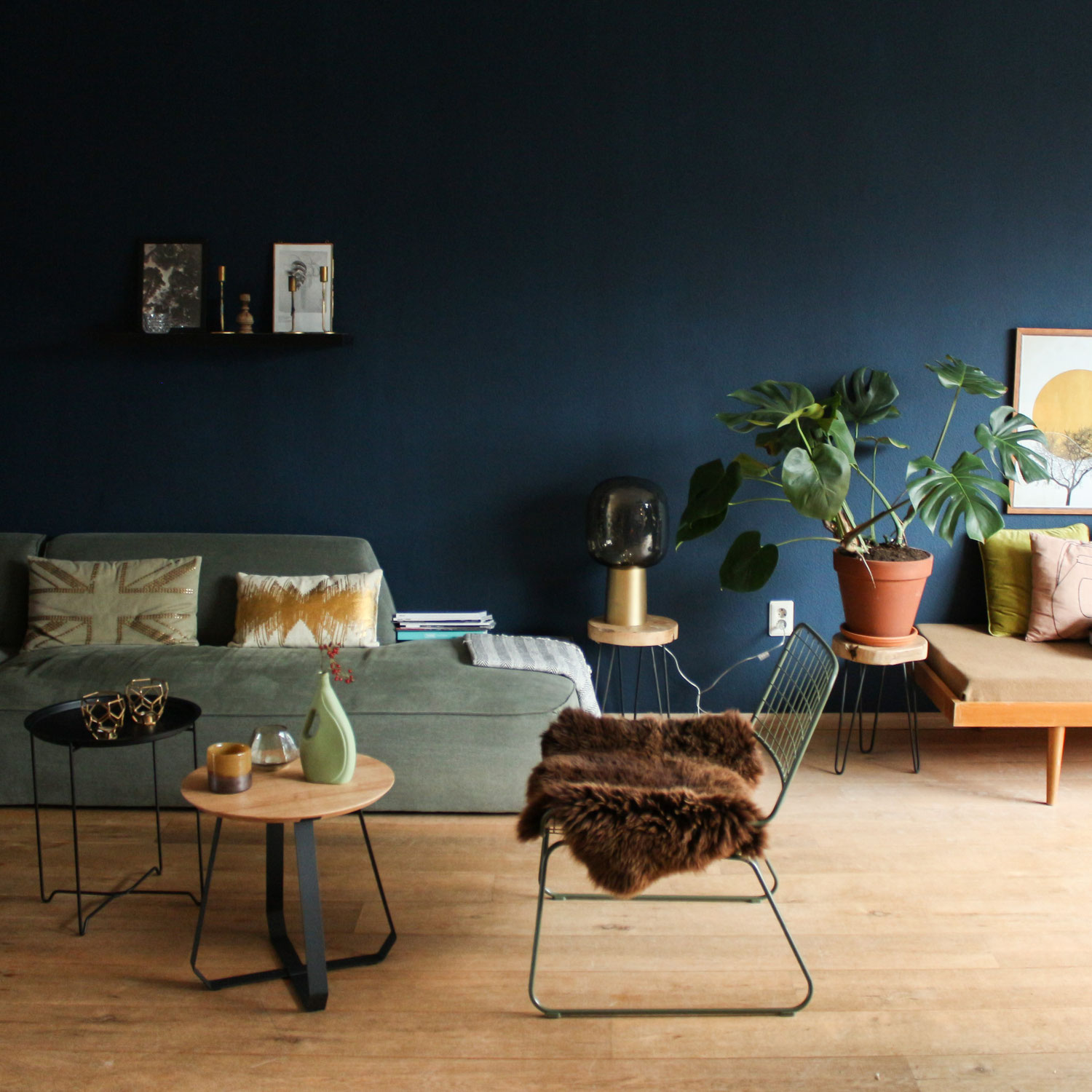 Sinds vorig jaar is er steeds meer kleur in ons huis gekomen. Hoe mooi ik witte interieurs ook vind, ik word toch het gelukkigst van mooie kleurencombinaties om me heen (en de rest van de familie gelukkig ook). En eerlijk gezegd miste ik door al dat wit in huis, de donkergrijze muur die we ooit hadden en waar alles zo mooi tegen uit kwam in contrast. Dat er een donkere muur terug moest komen was duidelijk, maar geen grijs meer. Donker blauw werd het. En niet gewoon donkerblauw, nee diep...